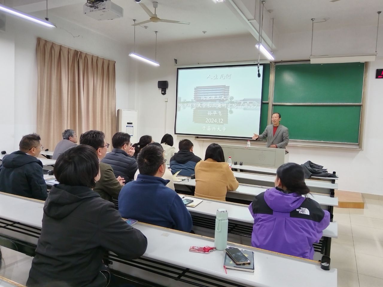 孙华飞以《人生几何》为题,通过幽默风趣的语言和精彩生动的事例,分享了他人生旅途的奇妙感受,学术生涯的酸甜苦辣和学生培养的独特快乐。他认为培养学生要本着尽力而为、不求回报,做学问要本着不求第一、追求唯一的精神。孙教授以自己跌宕起伏的人生经历、孜孜不倦的学术追求和桃李满天下的丰硕成果对师德师风做了很好的诠释。