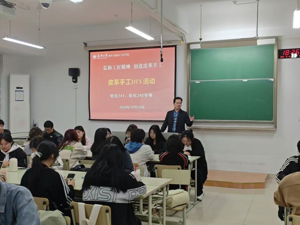轻化工程系于10月24日晚举办了一场别开生面的皮革手工DIY活动。轻化工程系主任罗建勋教授、洪新球老师和李书卿老师、轻化241、轻化242全体同学及轻化(专升本)241班志愿者参加此次活动。活动由洪新球老师主持。