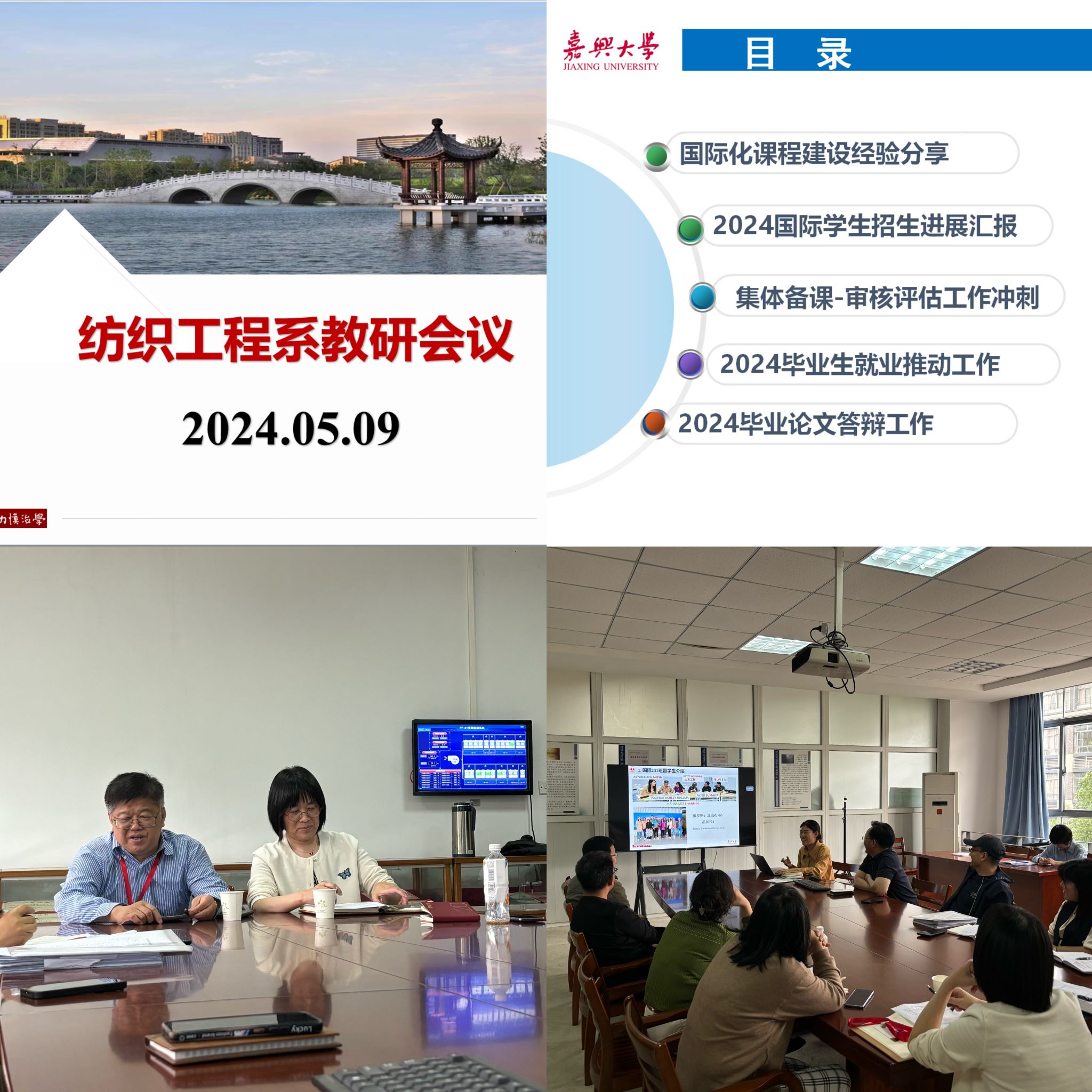 本次教研活动围绕国际化课程建设、国际学生招生、集体备课、学生就业、毕业设计,期中教学检查等内容开展。武鲜艳介绍了纺织工程系国际化课程目前建设现状及规划,2024国际学生招生进展,李艳艳老师分享了她在《专业导论(留)》国际化课程建设方面的经验。截至目前,纺织工程系共建有校级国际化课程建设项目5项,未来将进一步推动国际化课程建设,力争获批省级一流本科国际化课程,为国际化人才培养贡献力量。