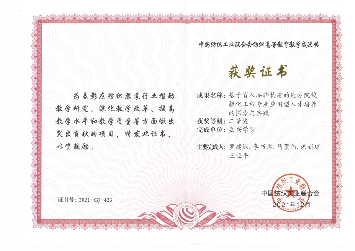 教师罗建勋、李书卿、马贺伟、洪新球、王亚平等组成的教科研团队申报的题为“基于育人品牌构建的地方院校轻化工程专业应用型人才培养的探索与实践”获“纺织之光”中国纺织工业联合会纺织高等教育教学成果二等奖。