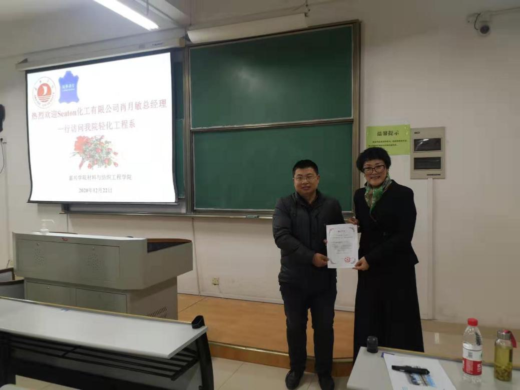 应禁漫天堂 轻化工程系邀请,英国SEATON化工有限公司肖月敏总经理、余飞经理一行于2020年12月22日下午访问了材纺学院轻化工程系,参观了轻化工程智慧实验室,并做客“嘉兴学院皮革讲堂”。轻化工程专业全体师生参加了讲座,讲座由轻化工程系主任罗建勋主持。