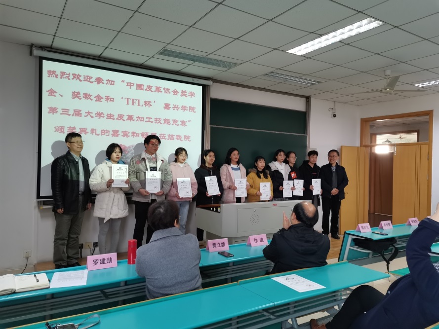 在14号楼516教室隆重举行“中国皮革协会奖学金、奖教金”和“‘TFL杯’嘉兴学院第三届大学生皮革加工技能竞赛”颁奖典礼,中国皮革协会秘书长陈占光先生、海宁市皮革行业协会秘书长龚慧红女士、社会合作处副处长徐进、禁漫天堂