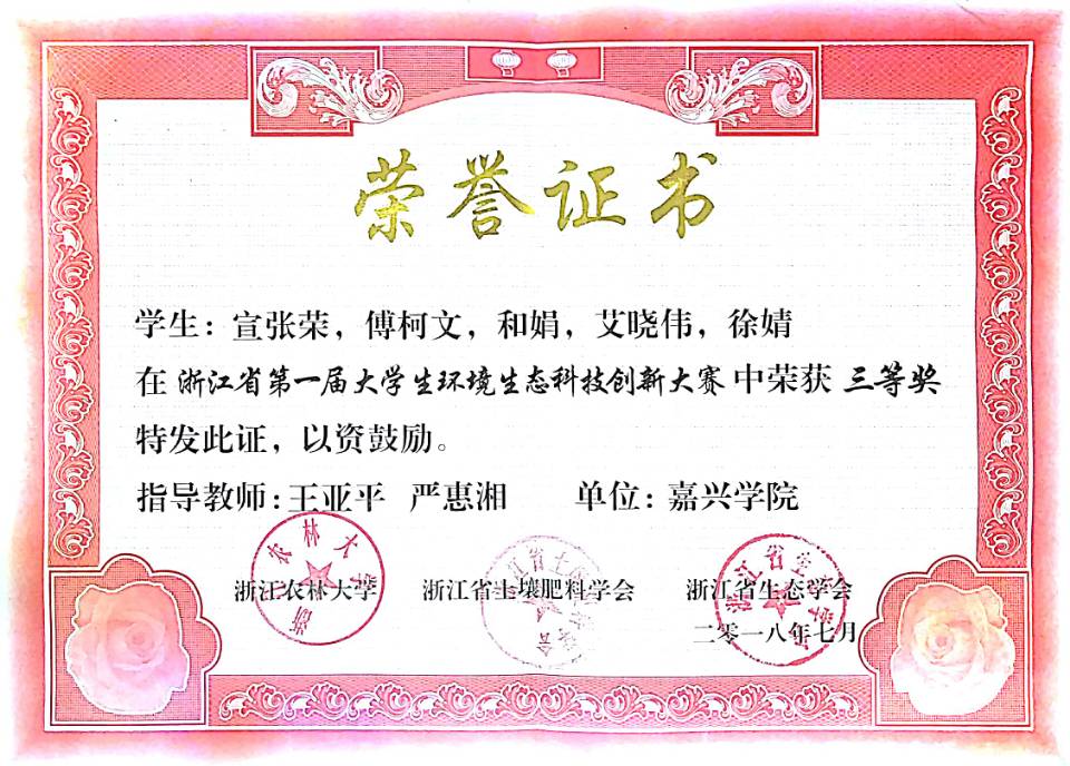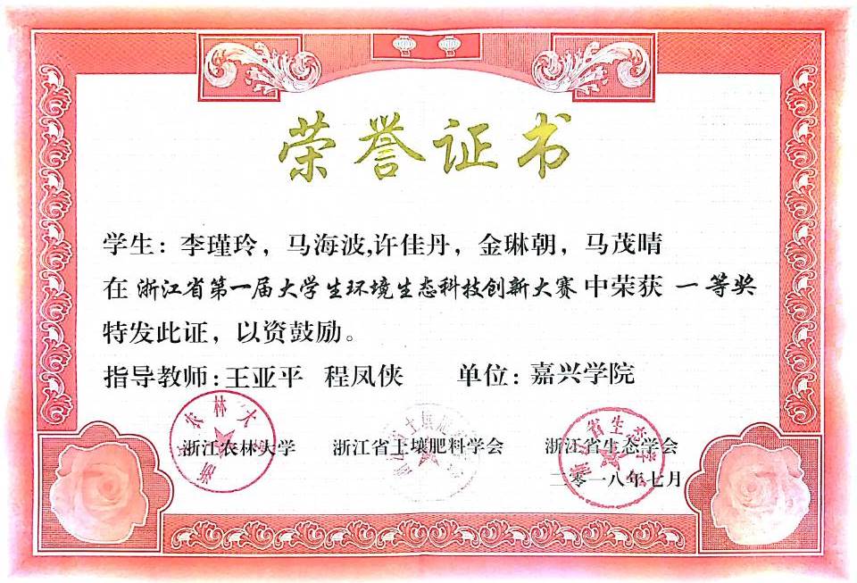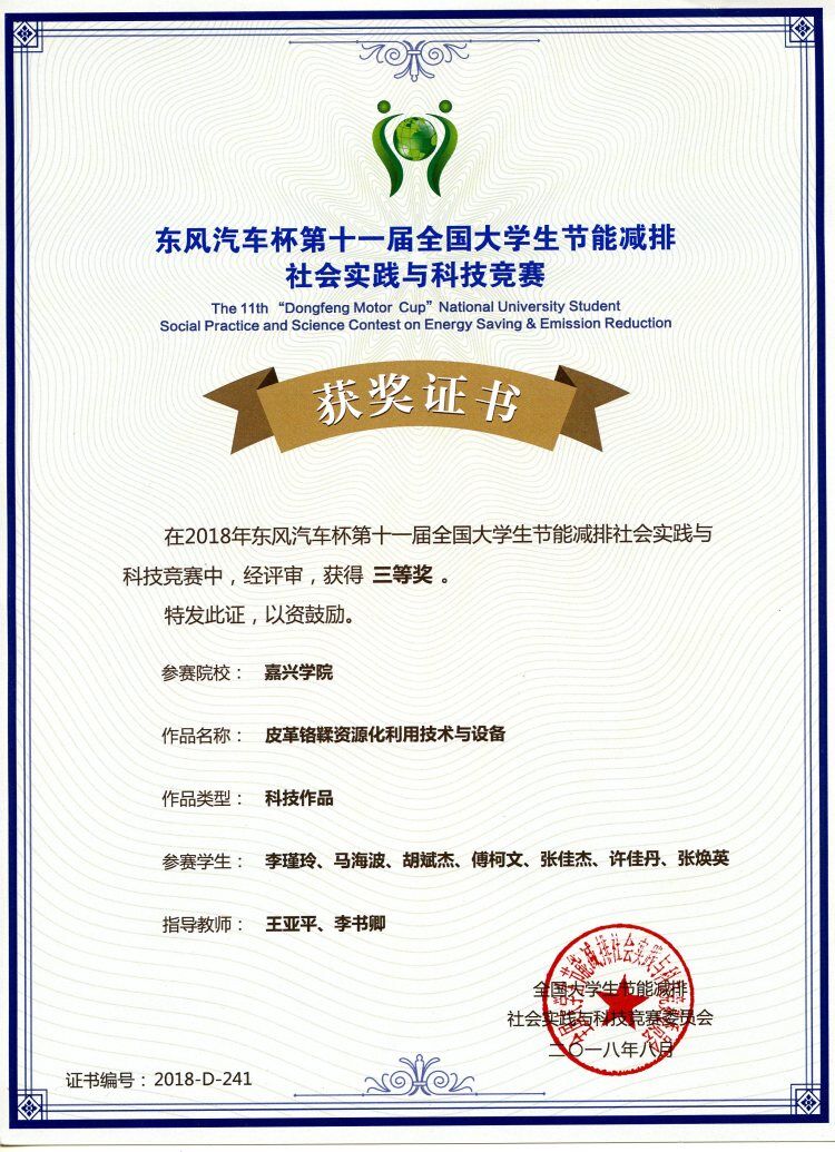 由禁漫天堂 王亚平、程凤侠、李书卿、黄芳芳等老师指导的轻化工程专业学生项目“铬鞣废液资源化利用及设备”和“皮革终水回用技术与设备”,先后获得:2018年东风汽车杯第11届全国大学生节能减排社会实践与科技竞赛三等奖(国家级AⅢ类); 2018年建行杯第四届浙江省“互联网+”大学生创新创业大赛铜奖(省级AII类,已公示);2018年浙江省第一届大学生环境生态科技创新大赛一等奖、三等奖(省级B类)。
