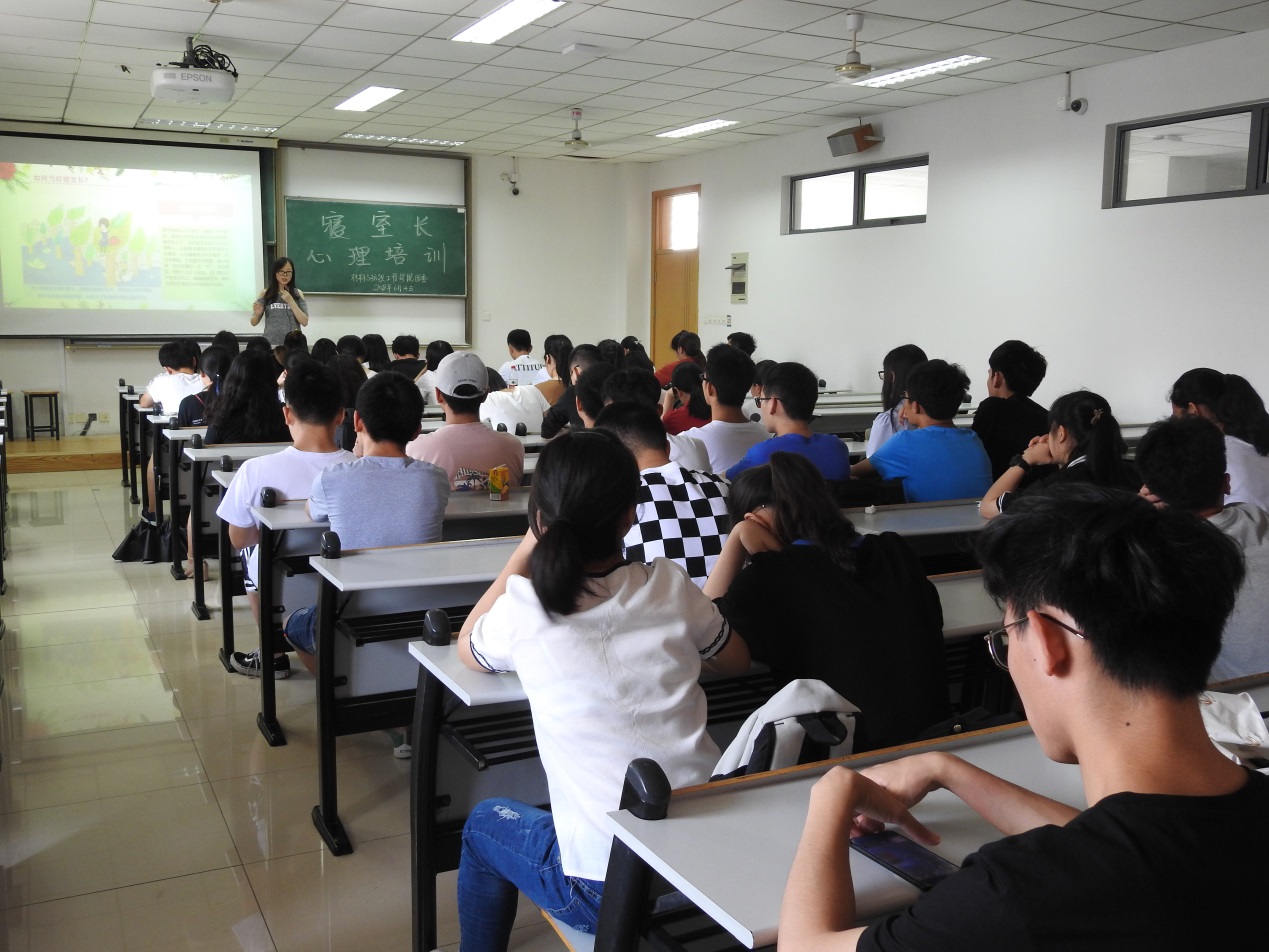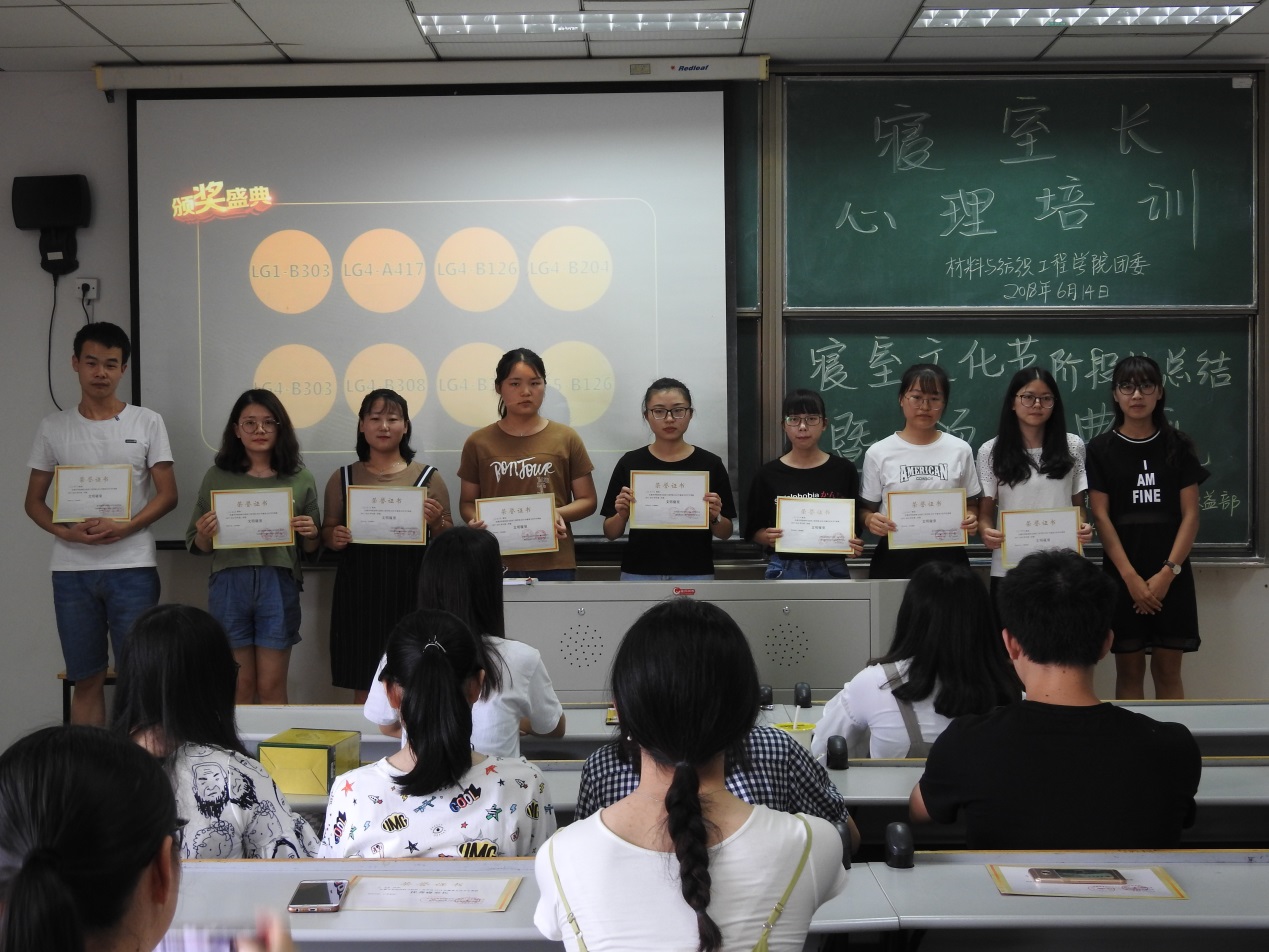 614日中午12:30,材纺学院于闻道楼502教室举行寝室长心理培训暨2017-2018学年寝室文化节颁奖典礼,获奖寝室及2017级所有寝室长参与其中。