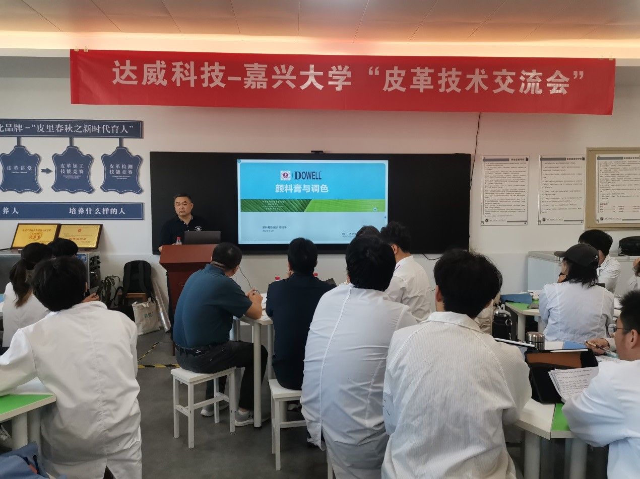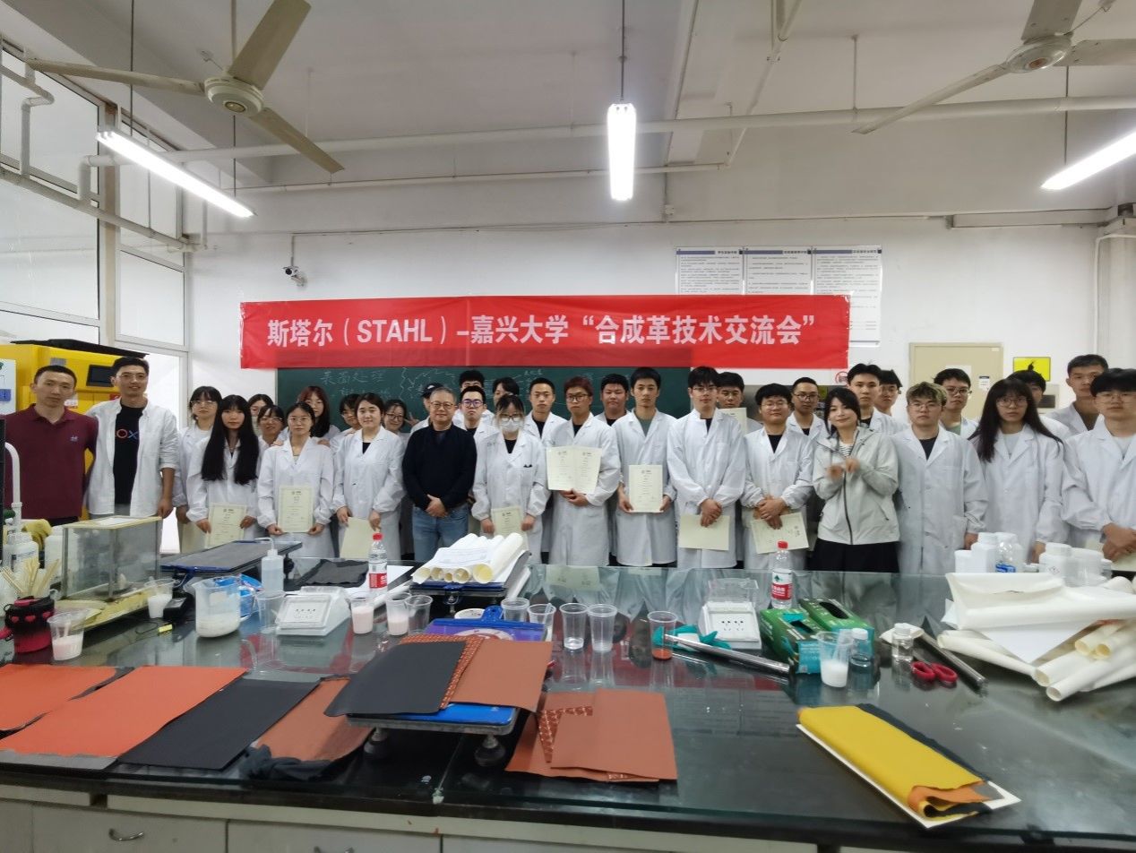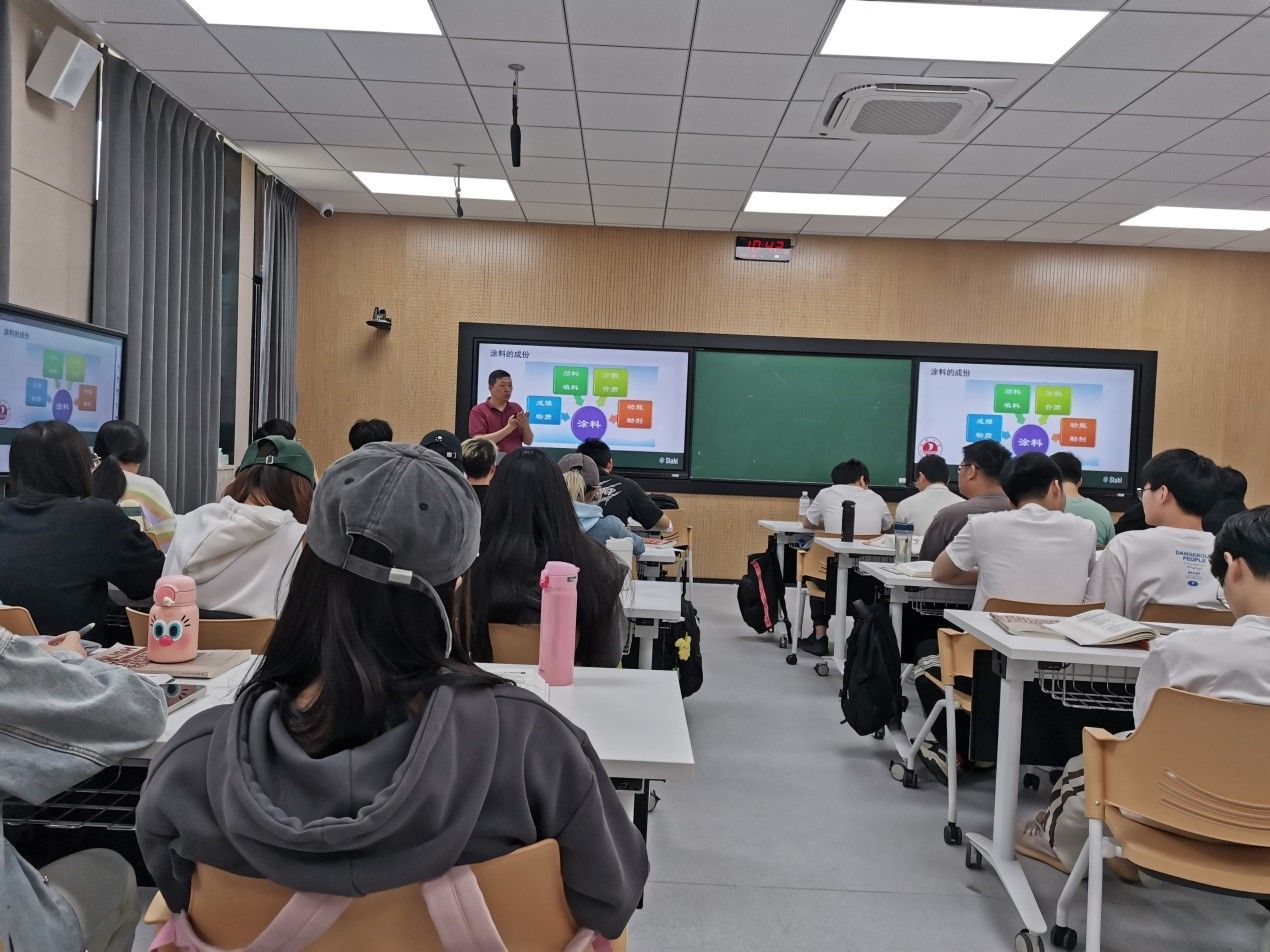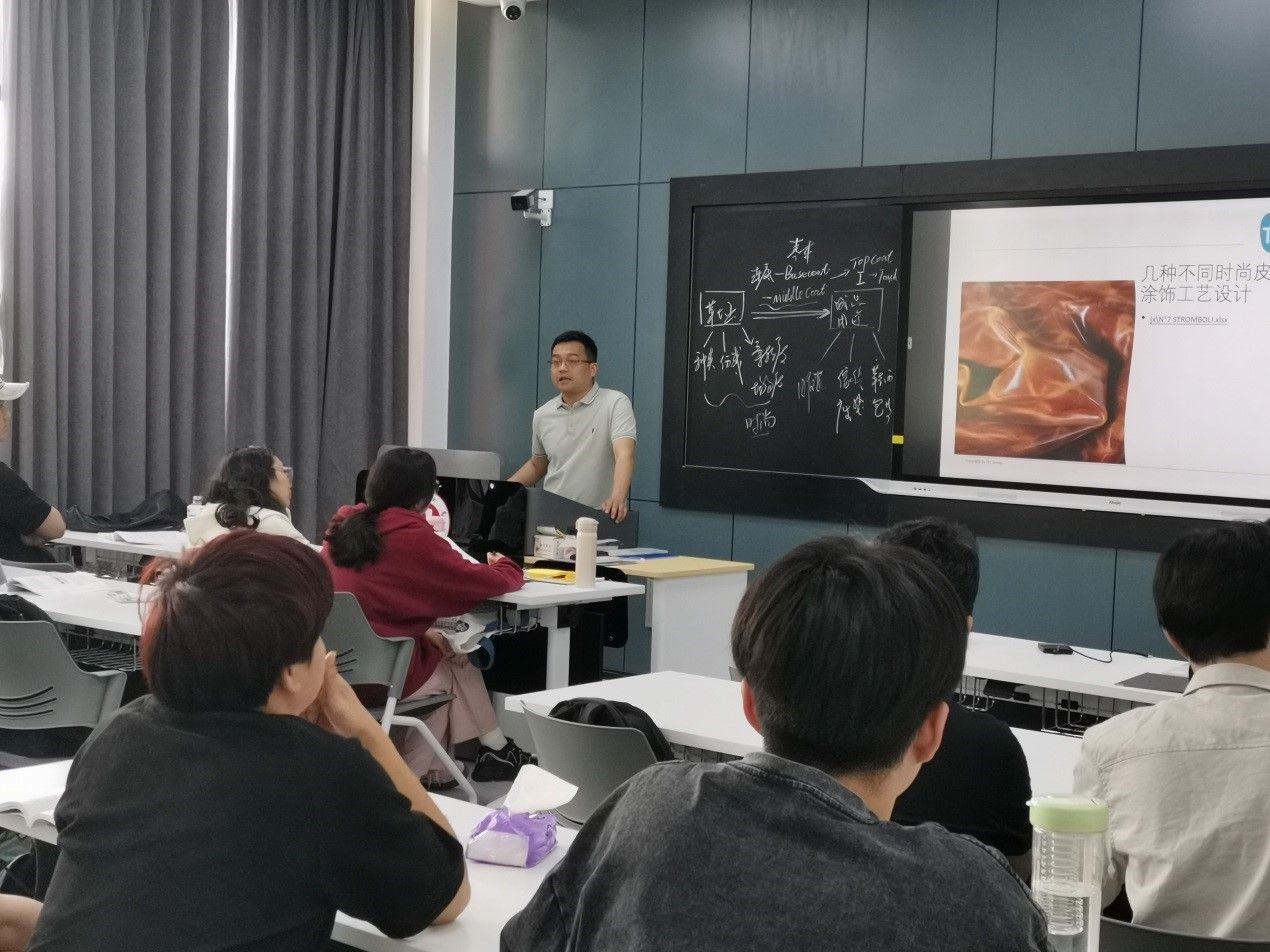 轻化工程系并给轻化(实验)211班学生、轻化生态合成革班讲授“时尚皮革与合成革现代产业学院”的产业课程之《皮革整饰化学及工艺学》中“时尚皮革涂饰工艺设计”、《合成革工艺学》中的“合成革表面处理技术”、《皮革色彩调配基础及应用》中的“颜料膏与颜色”和《时尚合成革设计与制作》中的“合成革干法与表面处理技术”。系列活动由系主任罗建勋教授主持,马贺伟副教授、李书卿老师等轻化工程系教师全程参加。