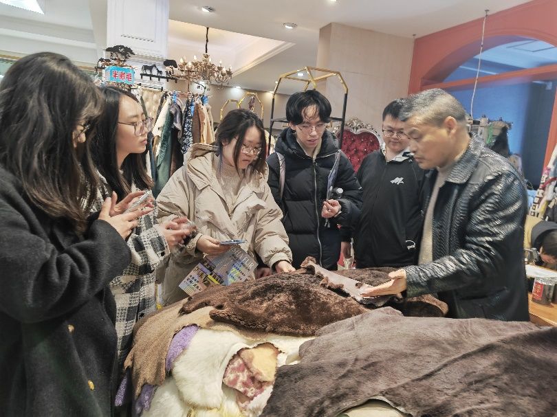 师生们此行受到了毛皮商铺负责人的热烈欢迎,他们就毛皮用原料皮与裘革面料等相关知识向学生进行了详细的讲解,并耐心地回答学生们提出的各种问题。在研学过程中,学生不仅直观地学习和比较了水貂、狐狸、羊皮、狼皮、青紫蓝、海狸、青根貂等几十种毛皮原料皮的结构特点、用途及裘革面料的风格等,而且对毛皮市场行情有了一定的了解,也加强了沟通和交流的技巧。