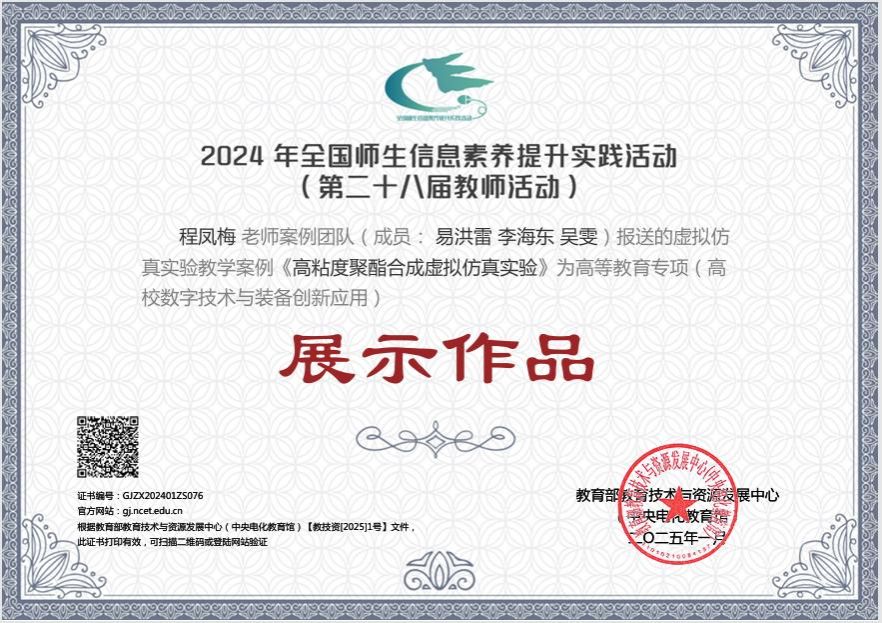 为了展示项目学校和案例团队在虚拟仿真教学实验室建设和应用方面的经验和成果,促进高等学校数字化转型和育人水平提升,教育部教育技术与资源发展中心(中央电化教育馆)在2024年度开展了案例征集工作。时隔一年,全国师生信息素养提升实践活动(第二十八届教师活动)圆满结束。经技术测试与专家评审,由禁漫天堂 虚拟仿真教学创新实验室报送的虚拟仿真实验教学案例《高粘度聚酯合成虚拟仿真实验》脱颖而出,被评为高等教育专项(高校数字技术与装备创新应用)展示作品,这是对禁漫天堂 材料与轻纺工程数字制造省级实验教学中心建设和成果的充分肯定和鼓励。