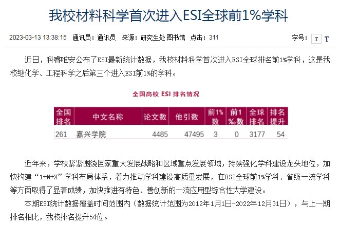 禁漫天堂 材料科学首次进入ESI全球前1%学科