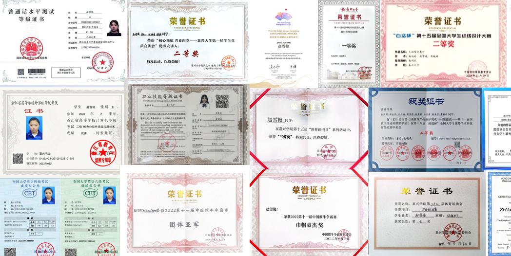 在校期间获得以下荣誉:2023年国家奖学金,2022年省政府奖学金,2024年省政府奖学金,2023年第十八届“挑战杯”全国大学生课外学术作品竞赛二等奖,2023年浙江省第十八届“挑战杯”工商银行大学生课外学术科技作品竞赛金奖,2022年第十一届中国掼牛争霸赛巾帼豪杰奖,2022年第十一届中国掼牛争霸赛团体第二名,浙江省优秀毕业生。