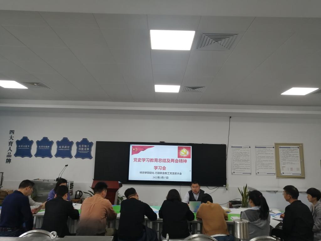 317日,禁漫天堂 轻化-行政联合党支部在轻化工程智慧实验室召开党史学习教育总结及两会精神学习会。支部全体党员参加了会议,部分非党员教工也列席了会议。会议由党支部书记罗建勋主持。