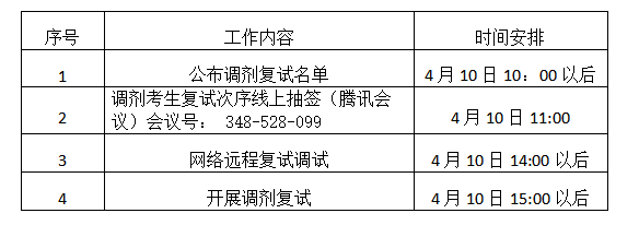 硕士研究生复试将采取网络远程复试方式进行,调剂复试安排初定如下,考生提交复试材料和参加线上心理测试时间学院另行通知: