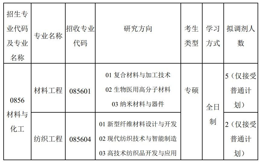 (2)调剂考生第一志愿专业与调入专业相同相近,或初试科目与调入专业初试科目相同相近。本学位点接受调剂的第一志愿专业范围包括:材料与化工(0856)、材料科学与工程(0805或0773)、电子科学与技术(0809或0774)、信息与通信工程(0810)、计算机科学与技术(0812或0775)、化学工程与技术(0817)、纺织科学与工程(0821)、轻工技术与工程(0822)、环境科学与工程(0830或0776)、生物医学工程(0831或0777)、药学(0780、1007或1055)、食品科学与工程(0832)、软件工程(0835)、生物工程(0836)、纳米科学与工程(0877或0789)、电子信息(0854)、机械(0802或0855)、资源与环境(0857)、生物与医药(0860)、化学(0703)、生物学(0710)。