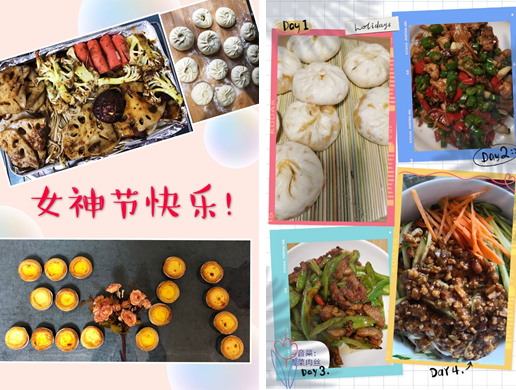 除了手工艺作品外,此次活动的一大亮点是食物的制作。中华料理源远流长,材纺学院众女神对美食的精髓把握深刻,并且在制作过程中,贯入对生活的理解和体会。陈子晗老师提供了包子和青菜肉丝拼盘。你看那封口的褶皱轮回盘转,是否特别像春天和煦的暖阳?李书卿老师在四川度过大学时代,辣子鸡里面,浸入的是天府之国的从容和豪迈。赵艳老师的面包和牛奶,一副笑脸在这样的日子里尤为可贵。陈洪旭老师东北名菜豆角土豆大乱炖和鸡翅更是最佳搭配。程凤梅老师的油饼配蛋花汤,再来一碗团团圆圆的混沌。周杰老师的猪猪包中好像还混入了一只小刺猬,这就是生活中的处处惊喜。大鱼大肉一定都吃腻了吧,吴雯老师给大家来些清淡的凉拌黄瓜木耳和藕片,一定可以调节大家油腻的味蕾。最后,不约而同的,李书卿、陈洪旭、史晶晶老师共同献上最经典的中华美食——美味的水饺。看着这些色香味俱佳的烹调作品,此刻坐在屏幕前的你,是否已经垂涎三尺?
